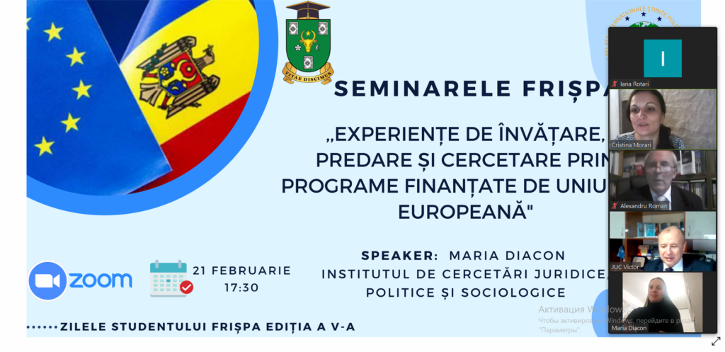 În contextul săptămânii ,,Zilele Studentului FRIŞPA”, a fost organizat seminarul ,,Experiențe de învățare, predare și cercetare prin programe finanțate de Uniunea Europeană” . În calitate de speaker, a fost invitată fosta absolventă FRIŞPA, doctor, conferențiar universitar, Maria Diacon, actualmente, cercetător în cadrul Institutului de Cercetări Juridice, Politice și Sociologice. Dna Diacon şi-a împărtăşit propria experienţă de participare în cadrul programelor de studii şi cercetare realizate în Uniunea Europeană. Totodată, dumneaei a relatat despre mecanismele şi programele UE de cercetare disponibile pentru cetăţenii Republicii Moldova. La rândul său, participanţii la eveniment s-au arătat interesaţi de oportunităţile existente în domeniul mobilităţii academice, dar şi de modalitatea de accesare a acestora.