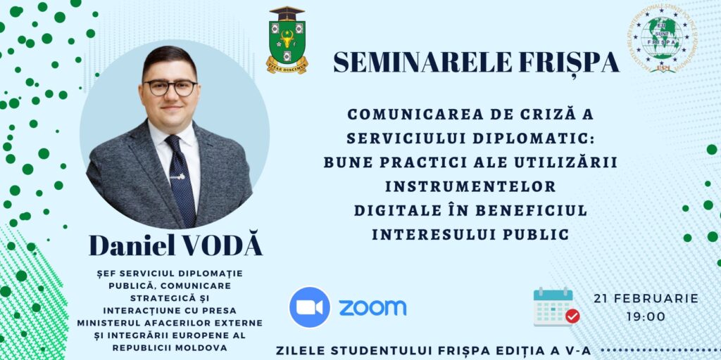 La 21 februarie 2022, în cadrul Zilelor Studentului FRIȘPA, a fost organizat Seminarul FRIȘPA „Comunicarea de criză a serviciului diplomatic: bune practici ale utilizării instrumentelor digitale în beneficiul interesului public”, speaker fiind Daniel VODĂ, șeful Serviciul diplomaţie publică, comunicare strategică şi interacţiune cu presa al Ministerului Afacerilor Externe și Integrării Europene al Republicii Moldova. Învitatul seminarului, absolventul FRIȘPA, Daniel VODĂ, a prezentat un discurs la tema enunțată, în care a relatat despre specificul și esența comunicării de criză a serviciului diplomatic, subliniind actualitatea și relevanța subiectului pentru comunitatea de studenți și profesori.