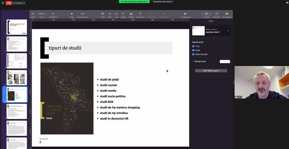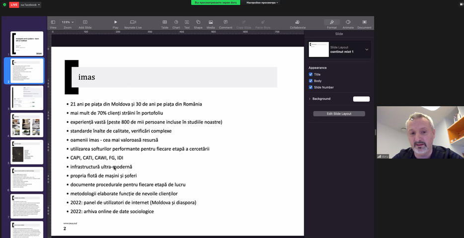 Invitatul la eveniment a început discursul său cu prezentarea Institutului de Marketing şi Sondaje (IMAS), despre activitatea companiei, serviciile pe care le prestează pe piaţa sondajelor în Republica Moldova. Doru PETRUŢI le a vorbit studenţilor FRIŞPA despre tipurile de studii pe care le realizează pentru diverşi clienţi, o atenţie specială acordând sondajelor politice. Invitatul a menţionat că sondajele în domeniul politicii ajută actorii politici să îşi formuleze mai bine problemele de guvernare în programe, să țintească grupele de electorat, să testeze mesajele electorale şi politice.