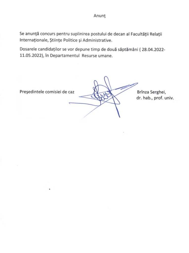 Se anunță concurs pentru suplinirea postului de decan al Facultății Relații Internaționale, Științe Politice și Administrative.